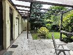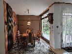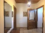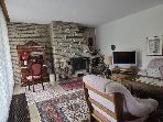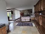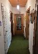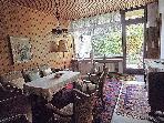 Die Hauptwohnung verfügt über 5 Zimmer, Küche, Diele, Bad, Gäste-WC und ein sehr geräumiges Wohnzimmer. Blickfang im Wohnzimmer ist der offene, verklinkerte Kamin. In Flur und Wohnzimmer wurden Solnhofer Platten verlegt. Küche und Essbereich sind durch Einbauschränke getrennt, die Küche kann also problemlos auch als offene Küche gestaltet werden. Das Wohnzimmer verfügt über eine große Schiebetür zur Süd-Terrasse hin, die mit einer Holzpergola überdacht ist. Hier kann man sich einen gemütlichen Außenbereich gestalten.
